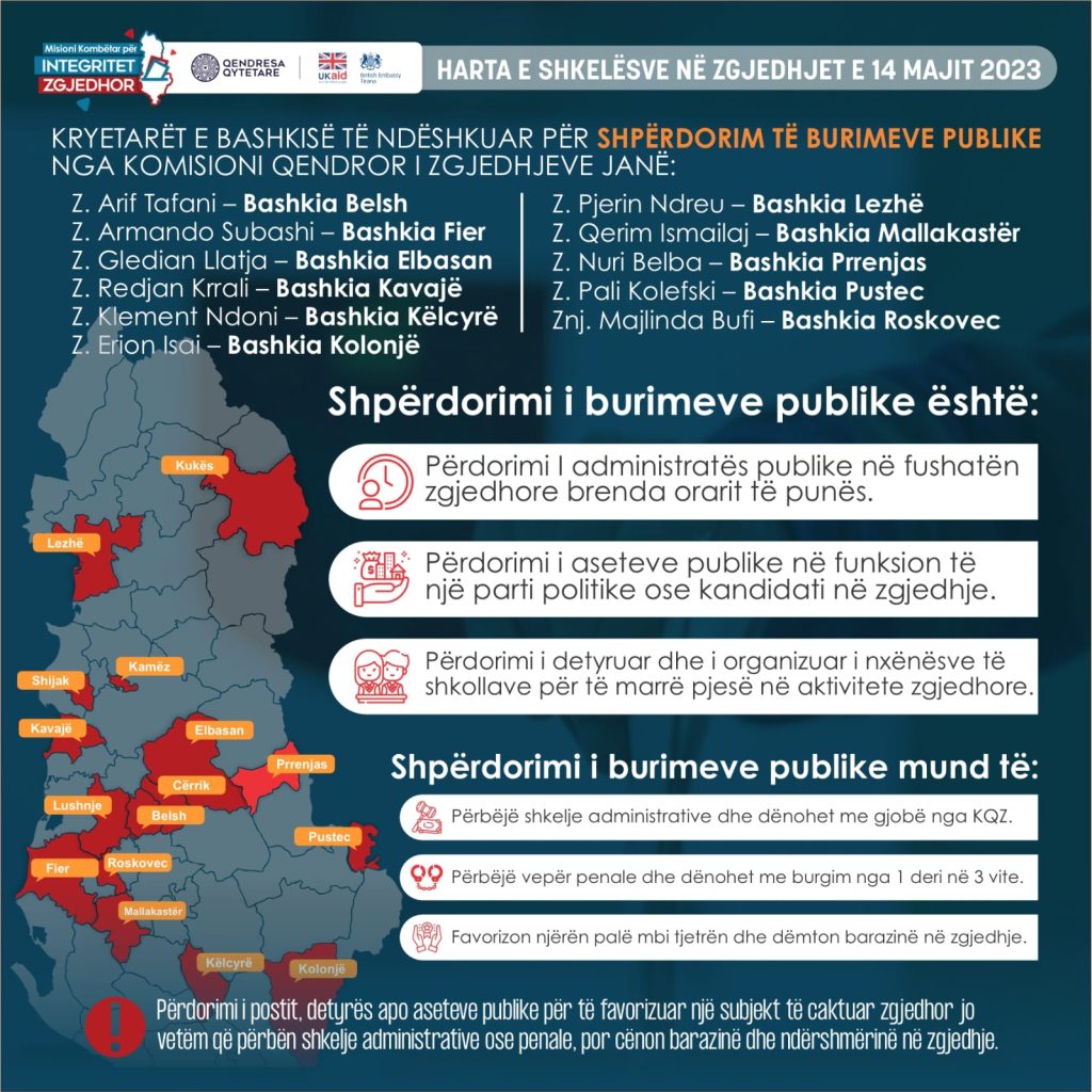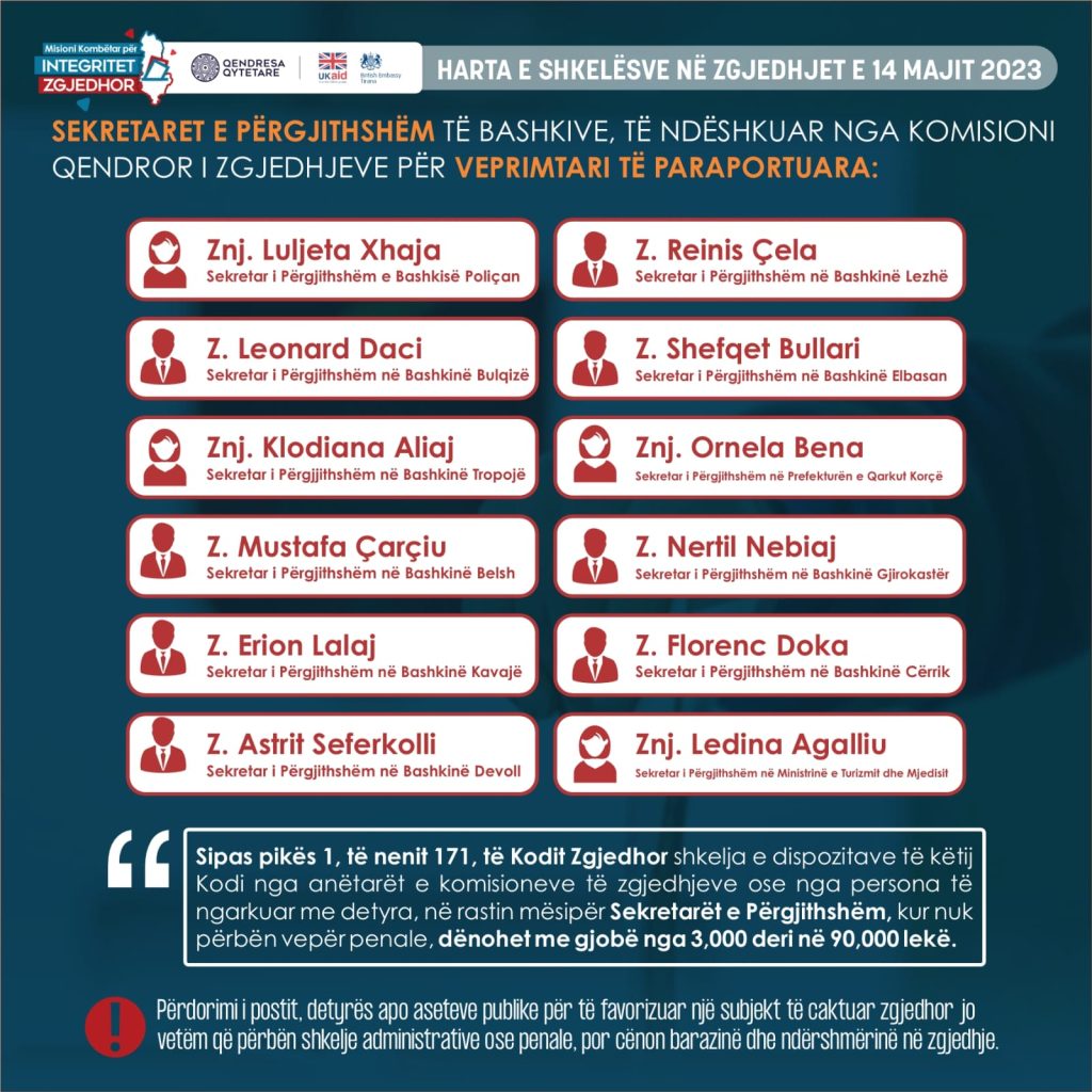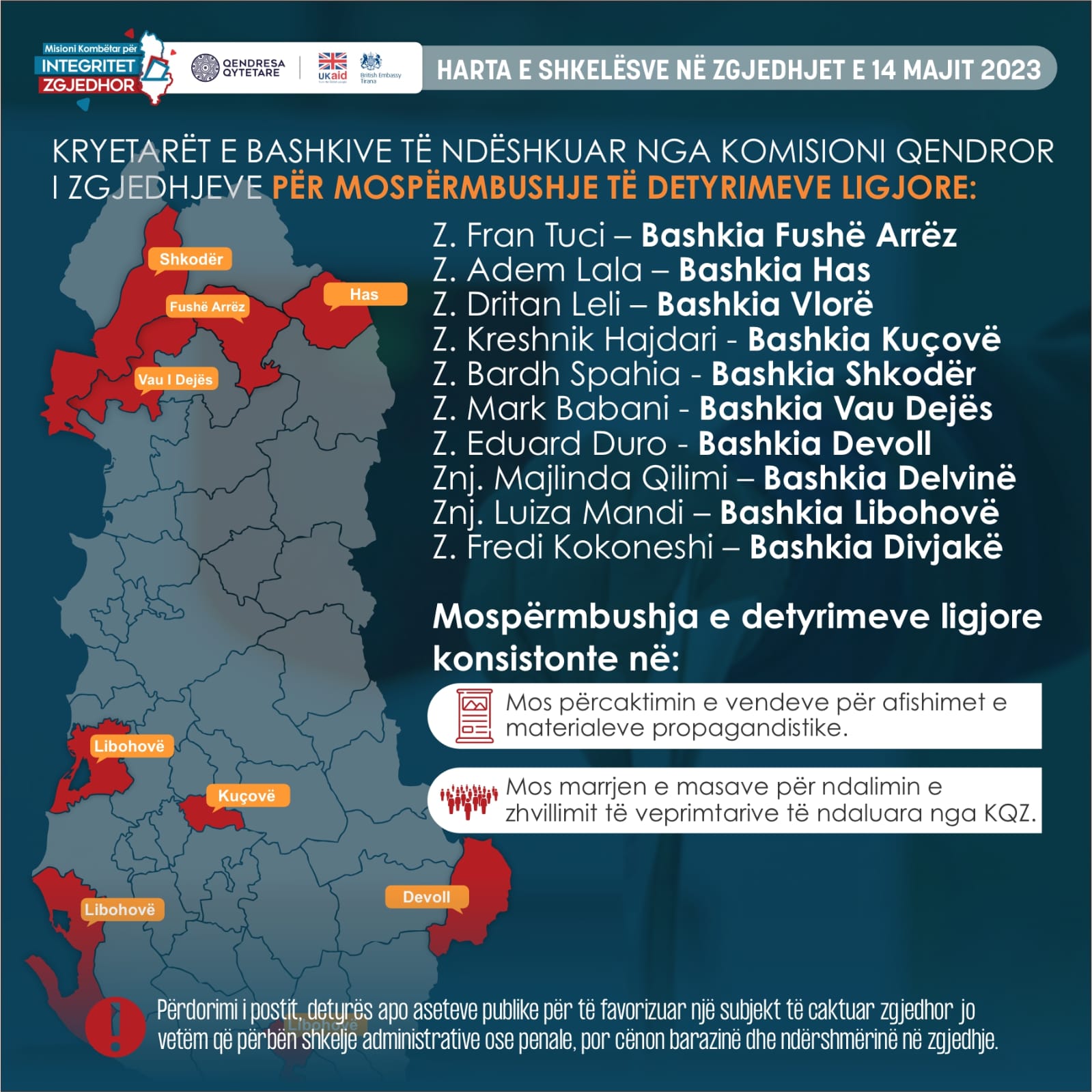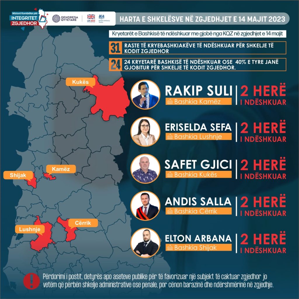 5 nga 22 Kryetarët apo ish-kryetarët e ndëshkuar të Bashkive rezultojnë të kërkojnë perseritjen e shkeljeve të tyre, madje disa nga këto subjekte aktualisht gëzojnë pozitën e personit nën hetim për vepra të ndryshme penale, ose statusin e të pandehurit apo të dënuarit. Ky fakt shton dhe më shumë dyshimet se këto subjekte, nuk kanë respektuar dispozitat e Kodit Zgjedhor në të njëjtën mënyrë sikundër nuk kanë respektuar legjislacionin në fuqi për veprat penale për të cilat janë nën hetim apo akuzohen të kenë kryer.