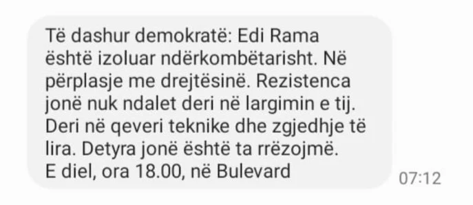 Ndërkohë është zbardhur edhe mesazhi i dërguar strukturave të Partisë Demokratike, ku thuhet se nuk do të ketë ndalje të reagimit deri në largimin e kryeministrit Edi Rama nga pushteti dhe arritjeve të një qeverie teknike