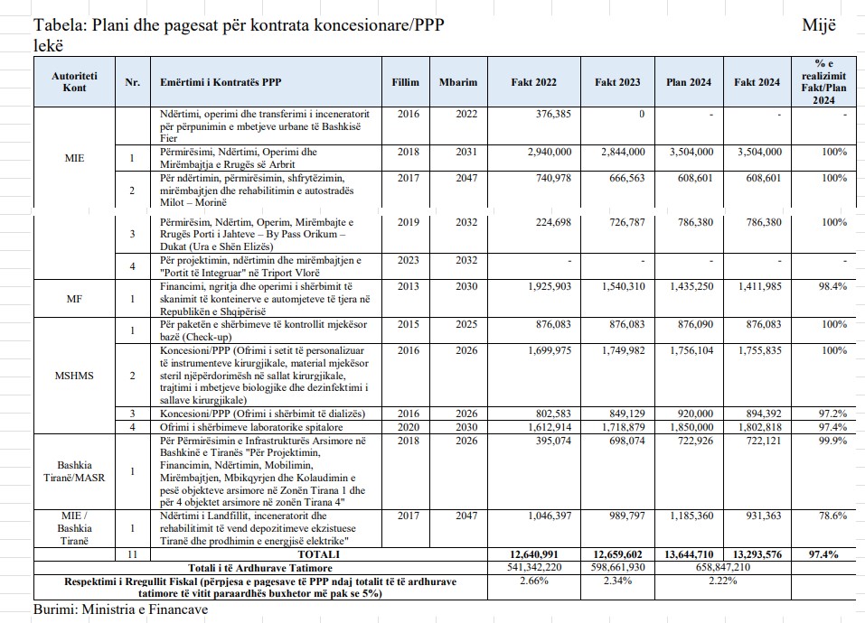 KLSH raportoi se për vitin 2024 rezultojnë 11 kontrata koncesionare PPP me mbështetje buxhetore. 10 kontrata rezultojnë me pagesa faktike, ndërsa për kontratën koncesionare/PPP “Për projektimin, ndërtimin dhe mirëmbajtjen e “Portit të integruar” në Triport Vlorë”, plani dhe fakti, rezultojnë 0 lekë.