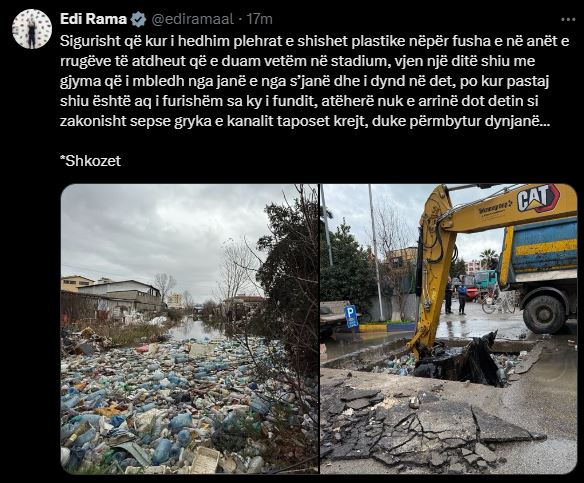 “Sigurisht që kur i hedhim plehrat e shishet plastike nëpër fusha e në anët e rrugëve të atdheut që e duam vetëm në stadium, vjen një ditë shiu me gjyma që i mbledh nga janë e nga s’janë dhe i dynd në det, po kur pastaj shiu është aq i furishëm sa ky i fundit, atëherë nuk e arrinë dot detin si zakonisht sepse gryka e kanalit taposet krejt, duke përmbytur dynjanë…”, shkruan Rama.