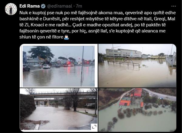 “Nuk e kuptoj pse nuk po më fajësojnë akoma mua, qeverinë apo qoftë edhe bashkinë e Durrësit, për reshjet mbytëse të këtyre ditëve në Itali, Greqi, Mal të Zi, Kroaci e me radhë… Çudi e madhe opozitat andej, po të paktën të fajësonin qeveritë e tyre, por hiç, asnjë llaf, s’e kuptojnë që aleanca me shiun të çon në fitore”, shkruan Rama.