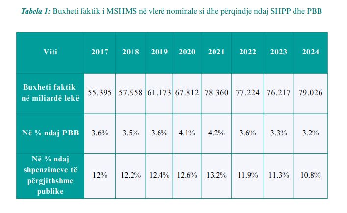 “Shpenzimet publike për sektorin e shëndetësisë Shpenzimet vetëm për sektorin e shëndetësisë gjatë vitit 2024 – duke përfshirë ato të deklaruara në Raportin e Monitorimit të Buxhetit të MSHMS si dhe të ardhurat nga Fondi i Detyrueshëm i Sigurimeve të Kujdesit Shëndetësor (FSDKSH) rezultojnë në masën 69.7 mld lekë. Këto shpenzime zënë 2.8% ndaj PBB dhe 9.6% ndaj Shpenzimeve të Përgjithshme Publike. Mesatarisht shpenzimet për shëndetësinë në përqindje ndaj Prodhimit të Brendshëm Bruto (PBB) në vite luhaten në intervalin 2.8%-3.4%, me një mesatare prej 3.1% të PBB. Ndërkohë shpenzimet e shëndetësisë ndaj shpenzimeve të përgjithshme publike përgjatë periudhës 2017-2022 rezultojnë në masën 10%. Në këtë mesatare është përjashtuar viti 2021, i cili rezulton me shpenzime të larta (one off) për shkak të menaxhimit të situatës pandemike të shkaktuar në vend nga virusi SARS COV 2”, thuhet në raport.