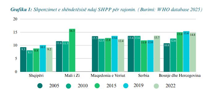 Në mënyrë shqetësuese, Shqipëria është vendi i fundit në rajon për financimin e shëndetësisë, pasi vendet fqinje si Mali i Zi dhe Maqedonia e Veriut, shpenzojnë më shumë se Shqipëria në raport me buxhetin e tyre vjetor.