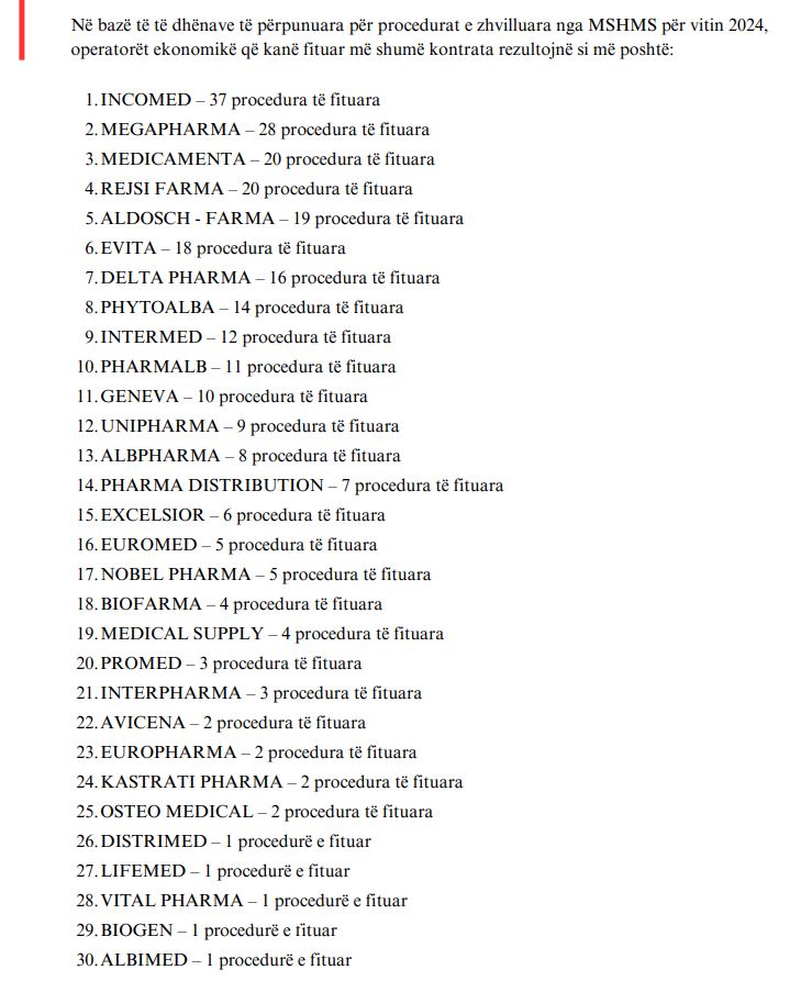 Vetëm kompania INCOMED ka fituar 37 procedura, ndërsa MEGAPHARMA ka fituar 28, duke e bërë praktikisht të pamundur për operatorët e vegjël apo të rinj të konkurrojnë. Ky centralizim i fituesve ngre dyshime serioze për favorizim dhe mungesë reale të barazisë në treg.