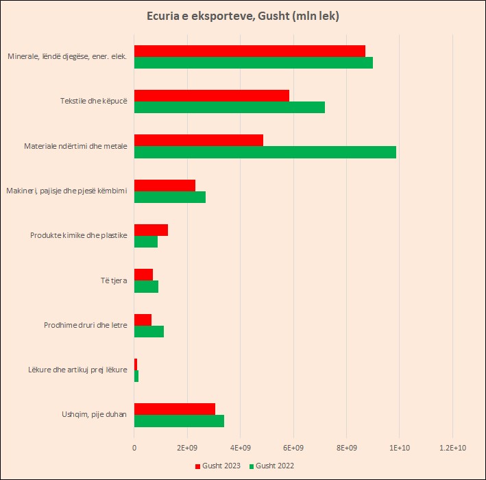Sipas INSTAT, Gjatë muajit Gusht 2023, në uljen e eksporteve prej -21,9 %, kanë ndikuar grupet: “Materiale ndërtimi dhe metale” me -14,3 pikë përqindje, “Tekstile dhe këpucë” me -3,8 pikë përqindje, “Prodhime druri dhe letre” me – 1,3 pikë përqindje. Ndërsa pozitivisht ka ndikuar grupi: “Produkte kimike dhe plastike” me +1,1 pikë përqindje.