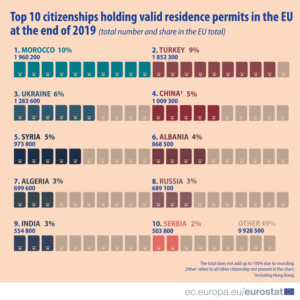 Eurostat jep edhe një shifër tjetër interesante. Deri në vitin 2019, janë 865 000 shqiptarë me qendrim të rregullt e ligjor jetojnë në vendet e BE. Nëse shton shifrat e vitit 2020, 2021 dhe 2021, atëherë kjo shifër i kalon 950 mijë shqiptarë. Këtu nuk llogariten shqiptarët që kanë lënë shtetësinë apo emigratët e paligjshëm.