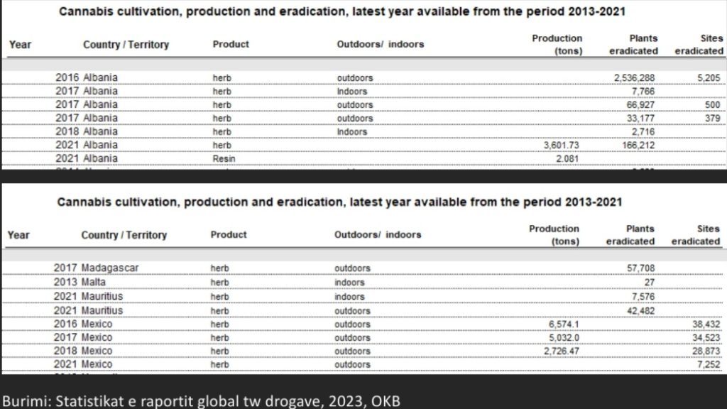 Në raportin e fundit të Zyrës Kundër Drogave dhe krimeve të Kombeve të Bashkuara janë publikuar shifrat e kultivimit të kanabisit, prodhimit dhe asgjësimit për periudhën 2013-2021 për shumë shtete të botës.