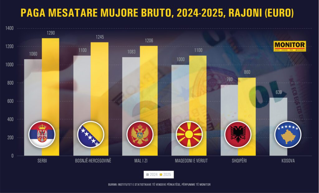 Edhe në 2025-n, paga mesatare mujore bruto, që marrin punonjësit Serbi, Maqedoni të Veriut, Mal të Zi e Bosnjë Hercegovinë ishte 30-50% më e lartë sesa e atyre shqiptarë, sipas të dhënave që u përpunuan nga “Monitor”, bazuar në statistikat e vendeve përkatëse. Përjashtim bën vetëm Kosova, që ka ende një pagë më të ulët sesa Shqipëria, ndonëse ajo nuk i ka publikuar ende të dhënat për vitin 2025.