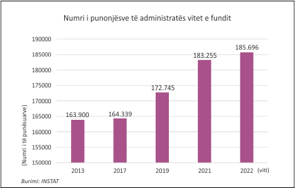 Gjatë vitit 2022, INSTAT raporton se administrata publike arriti në 184,396 persona, duke njohur një rritje prej 1.141 të punësuarish.