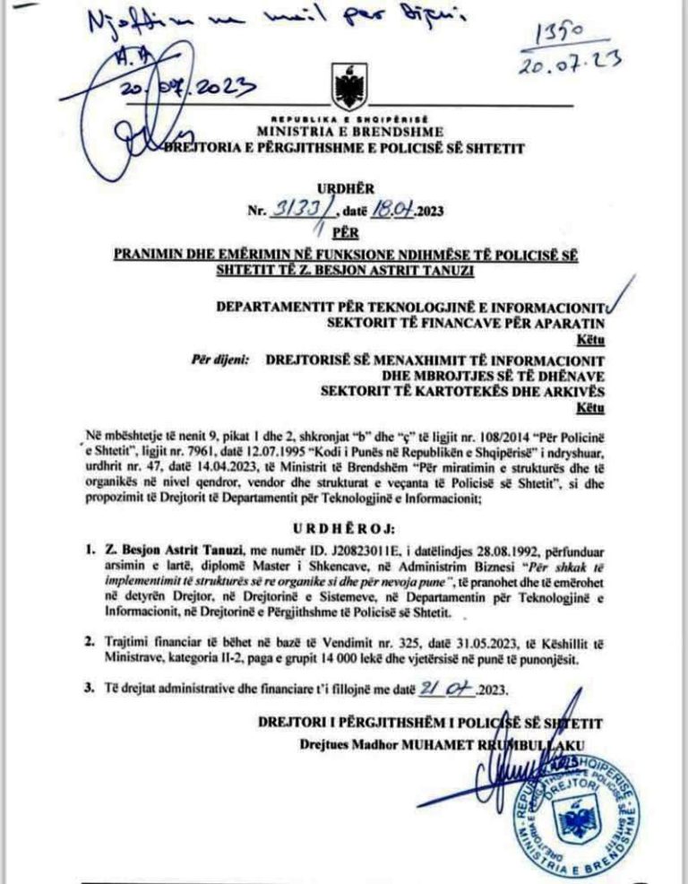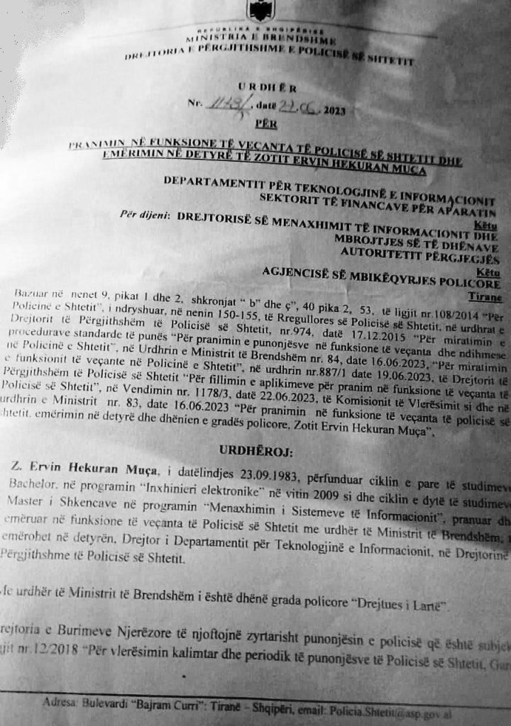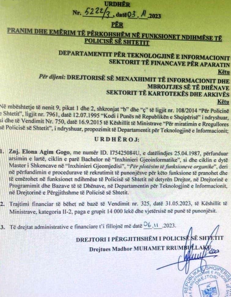 Megjithëkëtë, ai u emërua nga Drejtori i Përgjithshëm, Muhamet Rrumbullaku, (me urdhër të Ministrit të Brendshëm Bledi Çuçi), në datën 27 qershor 2023, me nr. Prot. 1178/5, në postin e Drejtorit të Departamentit të IT në Policinë e Shtetit, duke kapërcyer e duke shkelur ligjet.