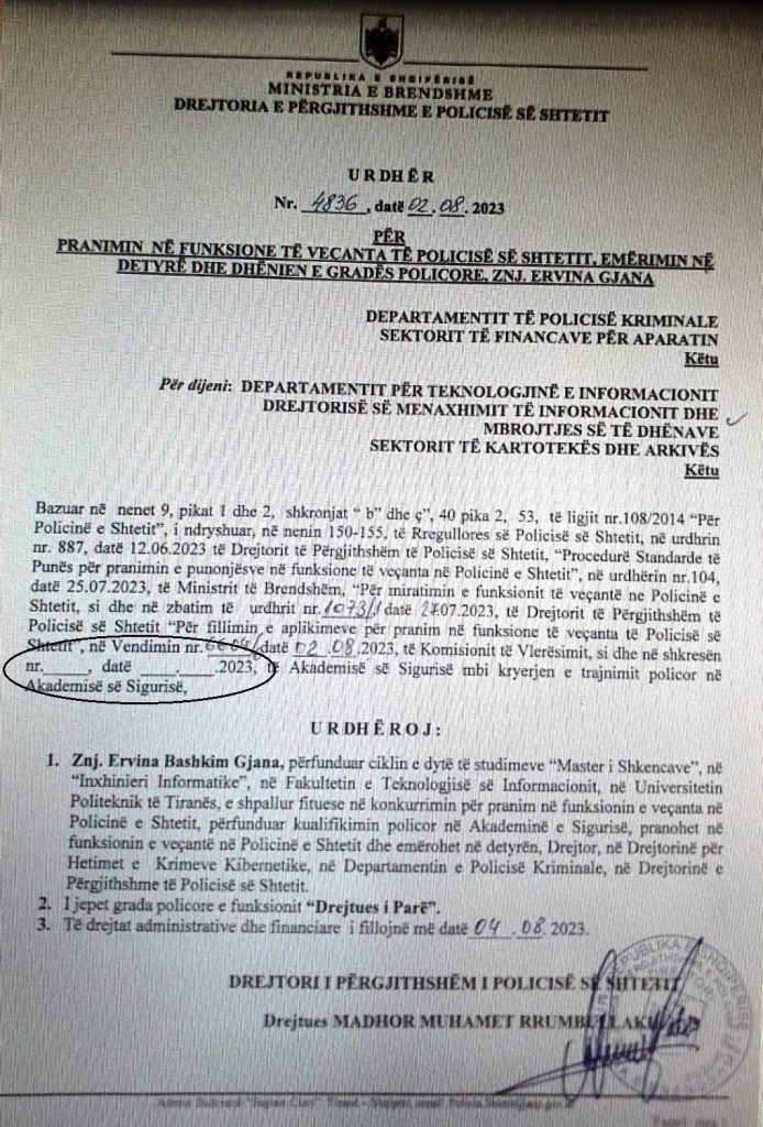 Paligjshmëria vërtetohet edhe në dokumentin e emërimit. Drejtori Rrumbullaku e ka lënë të paplotësuar pjesën ku duhet të shënonte numrin dhe datën e shkresës së Akademisë së Sigurisë, që duhet të vërtetonte se Gjana kishte kryer kursin e trajnimit policor.