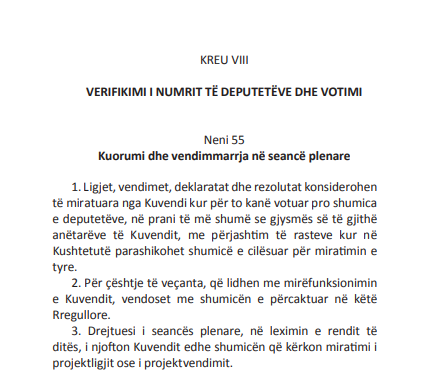 Sipas nenit 55 të rregullores së Kuvendit të Shqipërisë, “Ligjet, vendimet, deklaratat dhe rezolutat konsiderohen të miratuara nga Kuvendi kur për to kanë votuar pro shumica e deputetëve, në prani të më shumë se gjysmës së të gjithë anëtarëve të Kuvendit, me përjashtim të rasteve kur në Kushtetutë parashikohet shumicë e cilësuar për miratimin e tyre”.