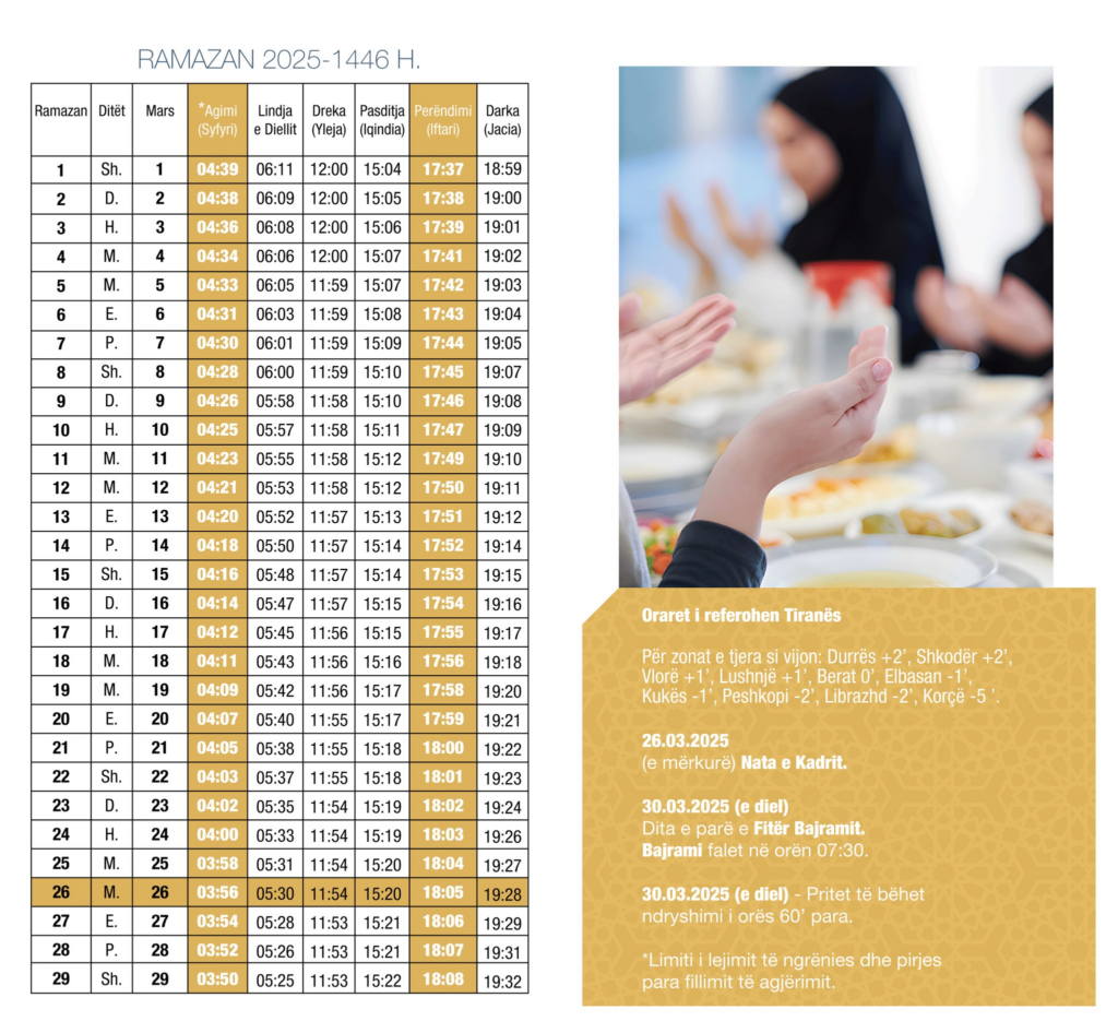Më poshtë kalendari zyrtar i muajit të Ramazanit