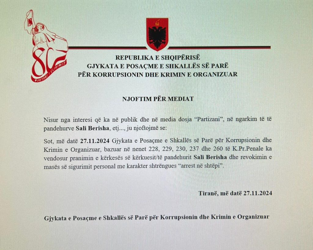 Berisha qëndronte në “arrest shtëpie” prej 30 Dhjetorit 2023, pasi nuk respektoi masën e sigurisë “detyrim paraqitje”. Ai është marrë i pandehur nga SPAK për “korrupsion pasiv” përsa i përket dosjes “Partizani”, teksa i pandehur është edhe dhëndri i tij, Jamarbër Malltezi.