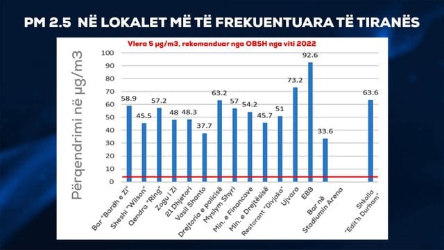 Sipas matjeve të kryera, mjediset e lokaleve pranë rrugëve kryesore të Tiranës tregojnë prezencën e grimcave vdekjeprurëse në nivelet nga 33.6 në 92.6 mikrogram/m3, shumë herë më e lartë se vlera e rekomanduar nga OBSH, 5 mikrogram/m3.