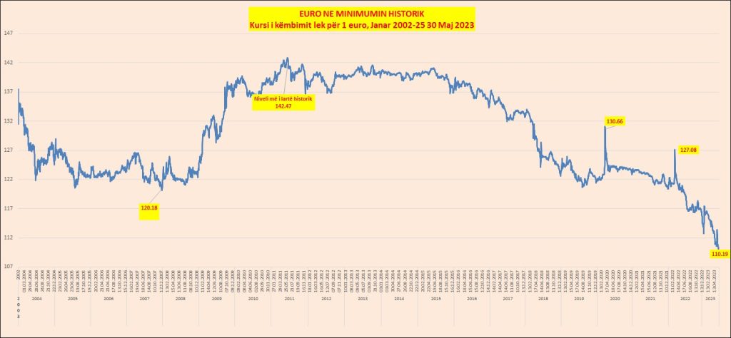 Kursi i këmbimit euro-lek ka pësuar sërish një rënie të fortë ditën e sotme duke prekur një minimum të ri historik.