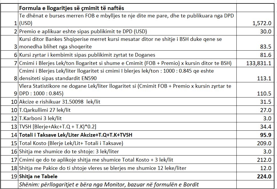 Bordi i Transparencës, që u riaktivizua rreth një javë më parë, e ka llogaritur çmimin, referuar të dhënave të dërguara nga Dogana lidhur me mbylljen e bursës Platts të datës 2.04. 2026, ku Gazoil (FOB- pa kosto sigurimi e transport) arriti në 1,572 $ / TON, nga 1370 USD që ishte ditën e mëparshme, me një rritje gati 200 dollarë për një ditë. Këtij çmimi i shtohet një Premio 30$/ton sipas publikimit të Doganave. Vetëm çmimi i blerjes arrin në 113 lekë për litër.