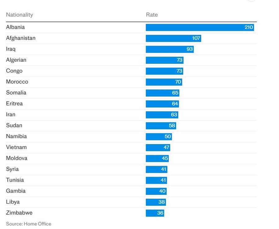 Tabela vendos shqiptarët si kombësinë më të mundshme për t’u arrestuar, të ndjekur nga afganët, irakianët, algjerianët dhe somalezët. Ishin deputetët konservatorë, ata që kërkuan publikimin e të dhënave, duke marrë shembull Danimarkën por edhe disa shtete të SHBA-së.