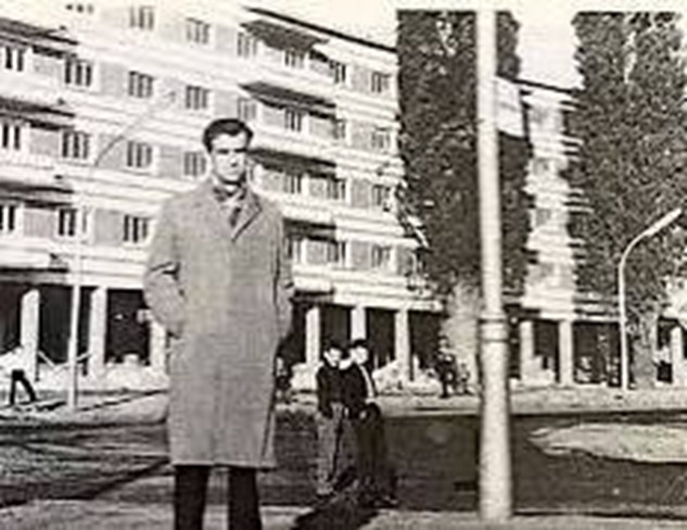 Petraq Kolevica përpara ndërtesës afër bankës kombëtare në vitin 1961.