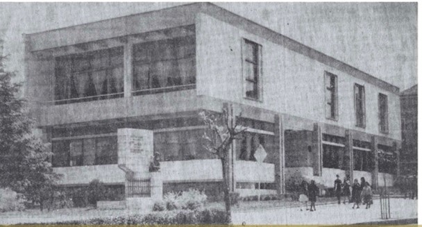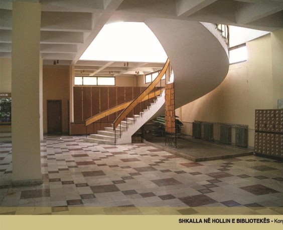 Pamje nga jashtë e Bibliotekës së Korçës, pak pasi u ndërtua si dhe interiori me shkallën e mrekullueshme.
