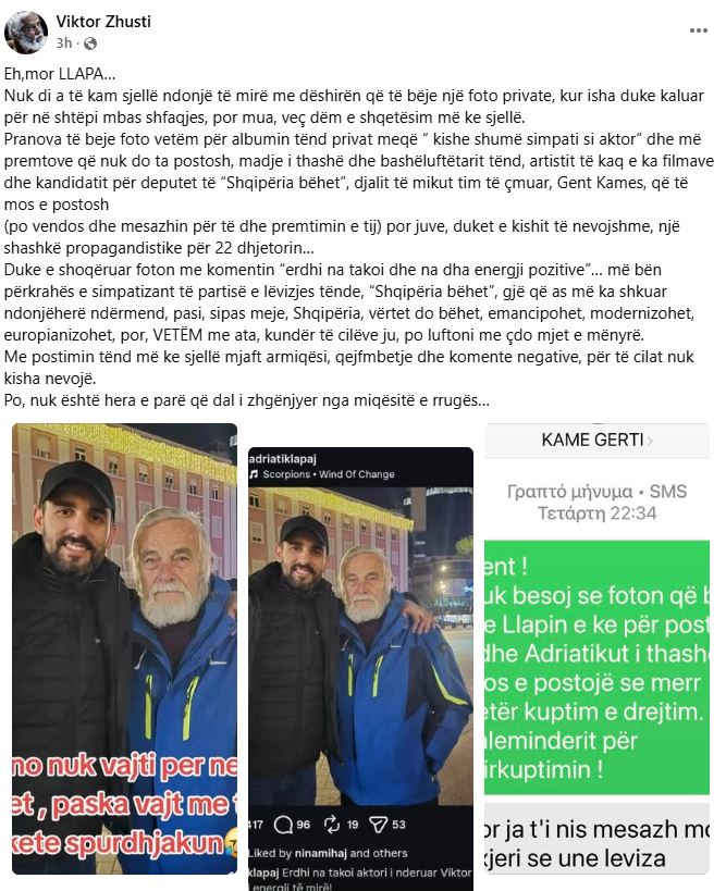Aktori i njohur Viktor Zhusti ka reaguar ashpër ndaj Adriatik Lapajt, duke e akuzuar se ka përdorur për qëllime propagandistike një foto që sipas tij ishte kërkuar në mënyrë private.