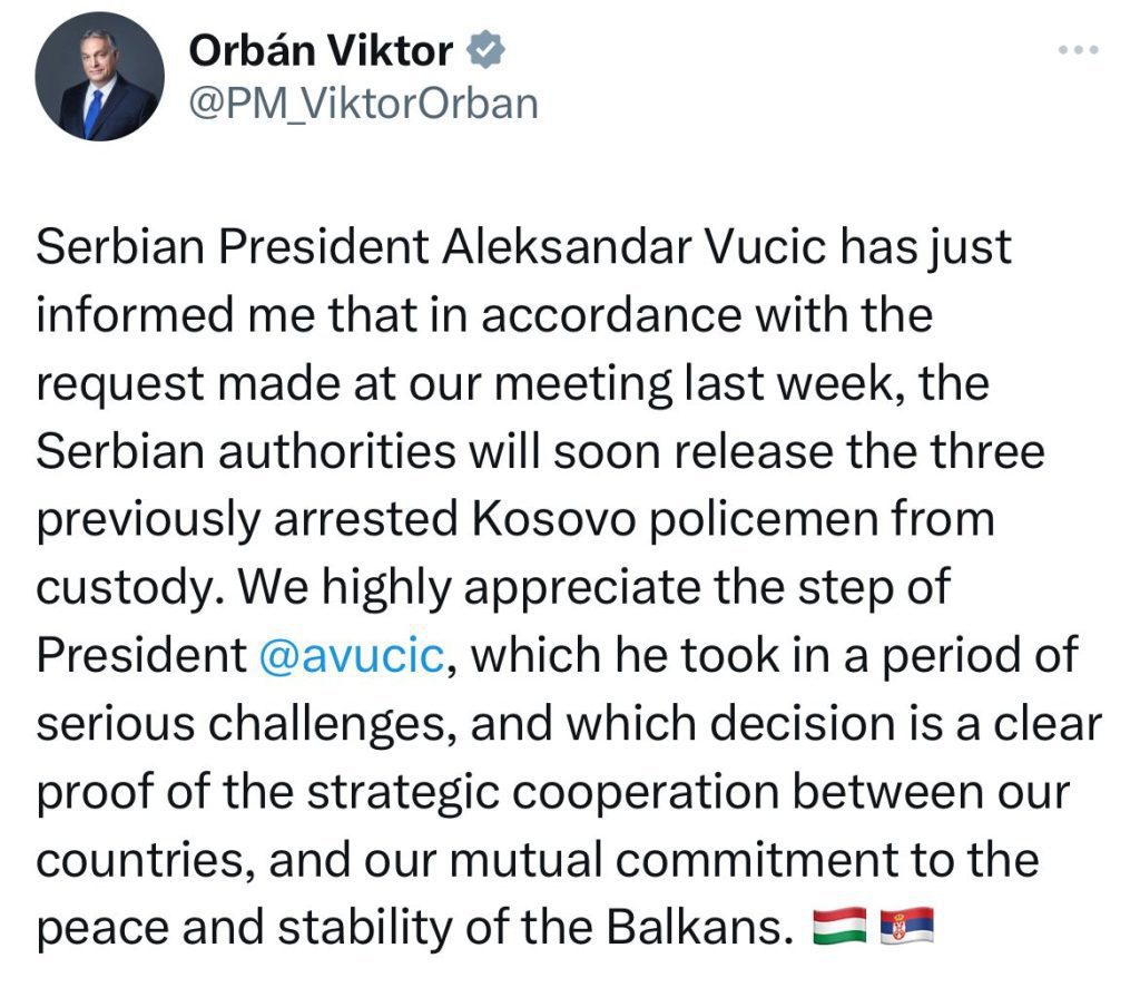 Kryeministri Hungarez, Viktor Orban pranoi sot në një qendrim zyrtar në Twitter se “Presidenti i Serbisë Aleksandër Vuçiç më informoi se, në përputhje me kërkesën e bërë në takim javën e kaluar, autoritet serbe do të lirojnë shpejt 3 policët e arrestuar të Kosovës”.