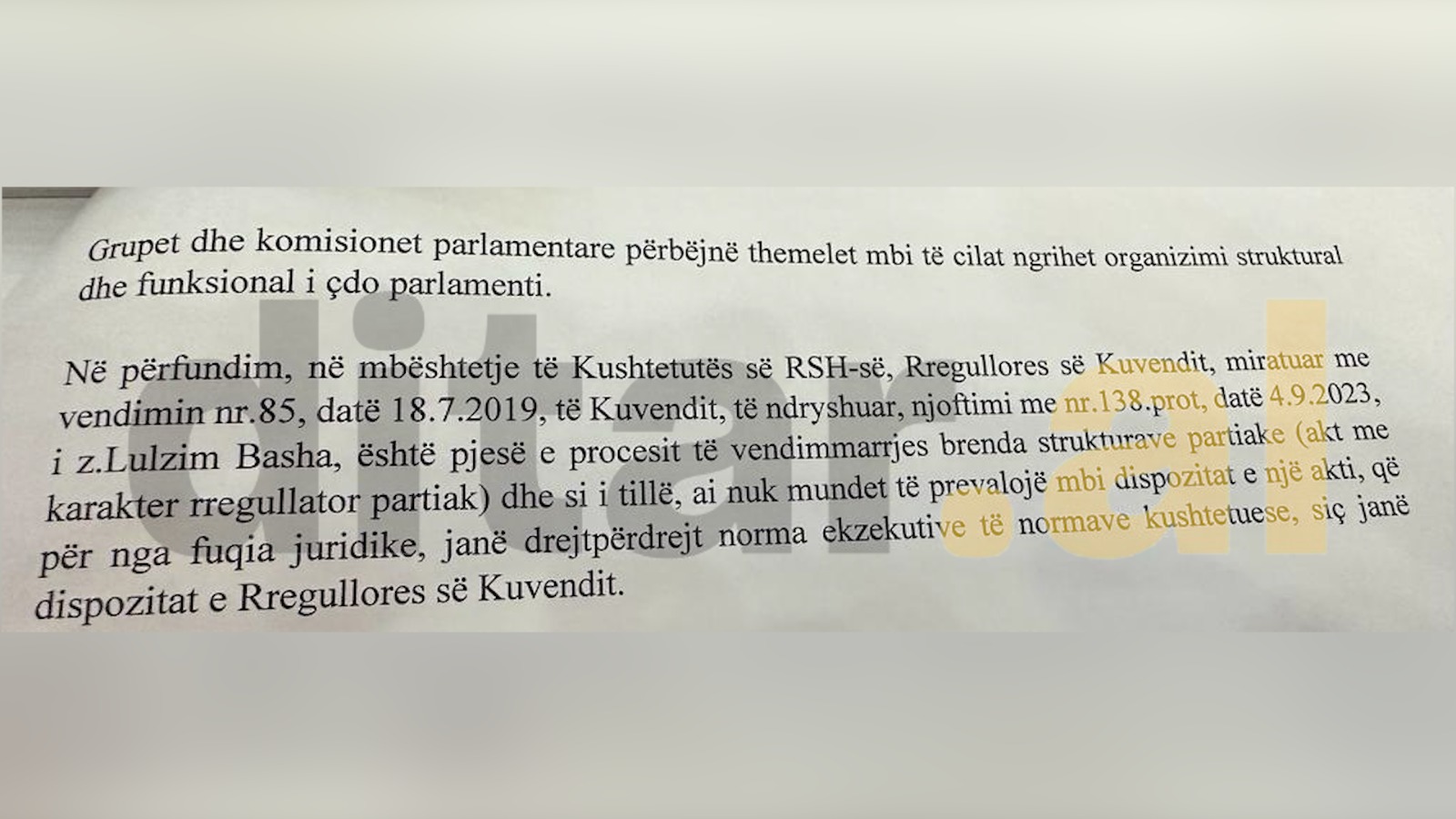 Në shkresën drejtuar Kuvendit, zyra juridike thotë se Lulzim Basha mund të marrë vendime brenda partisë, por nuk mund të prevalojë mbi rregullat e Kuvendit, pasi kreu i grupit parlamentar zgjidhet nga deputetët dhe jo nga Kryesia e partisë apo Këshilli Kombëtar.